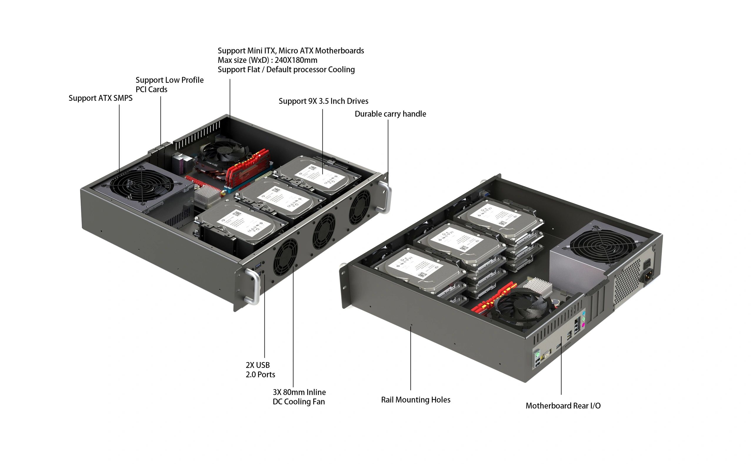 This 2U rack mount server case is designed for rackmount 2U NAS server which supporting upto 9 drives. This case support mini ITX and micro ATX motherboard, This case support 1 ATX SMPS. Built with 3 Nos of 80mm cooling fans and 2 Nos USB 2.0 at the front. This case suppport low profile PCI cards and graphic cards.