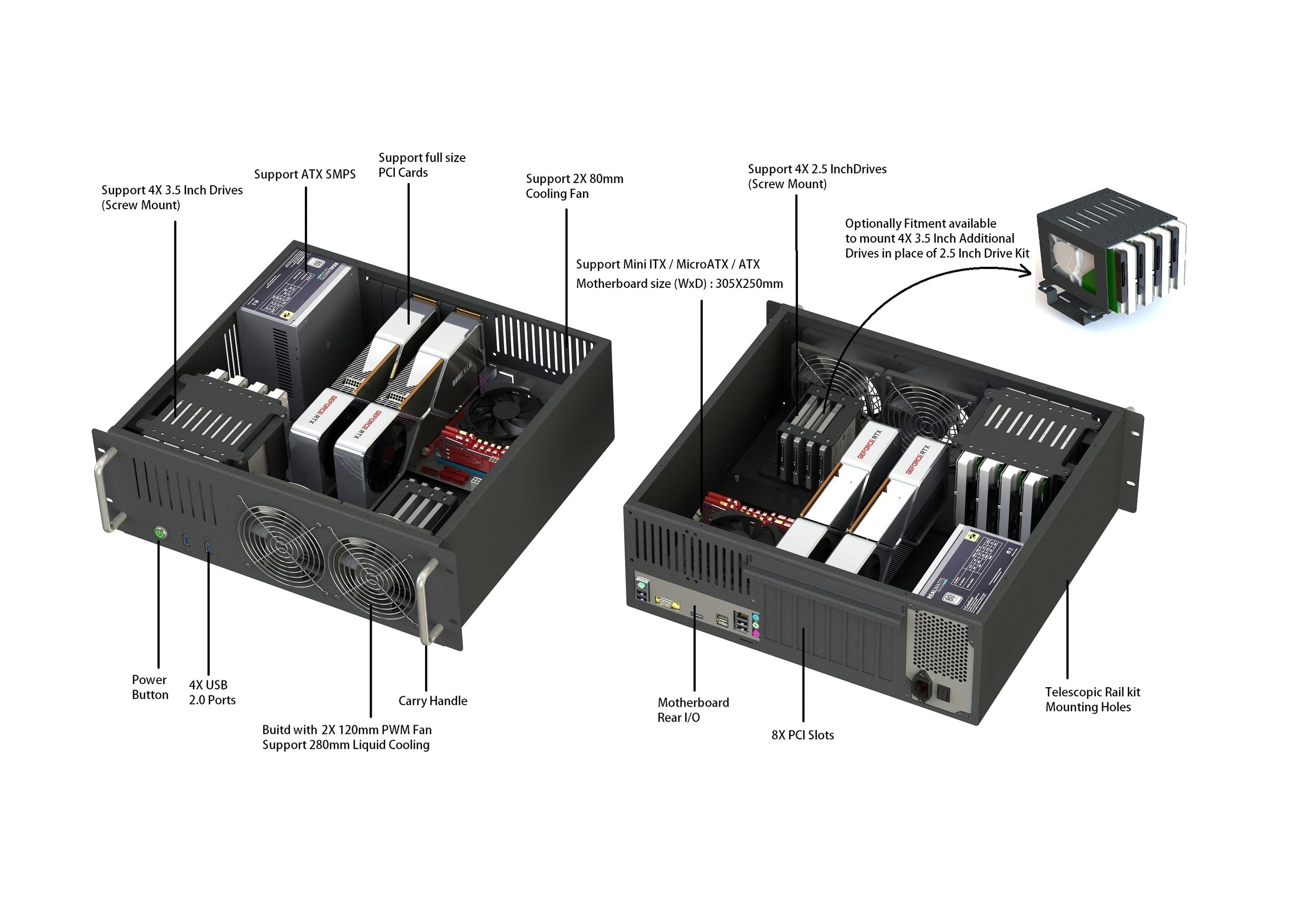 This 3U Rackmount server case is designed to support multiple drives and multiple larger GPU. This custom 3U server case support mini ITX, micro ATX and ATX motherboard, This case support 1 ATX SMPS. Built with 2 Nos of 120mm PWM cooling fans and 2 Nos USB 2.0 at the front. This fully industrial case also compatible with liquid cooling build with 2 Nos 120mm fans.