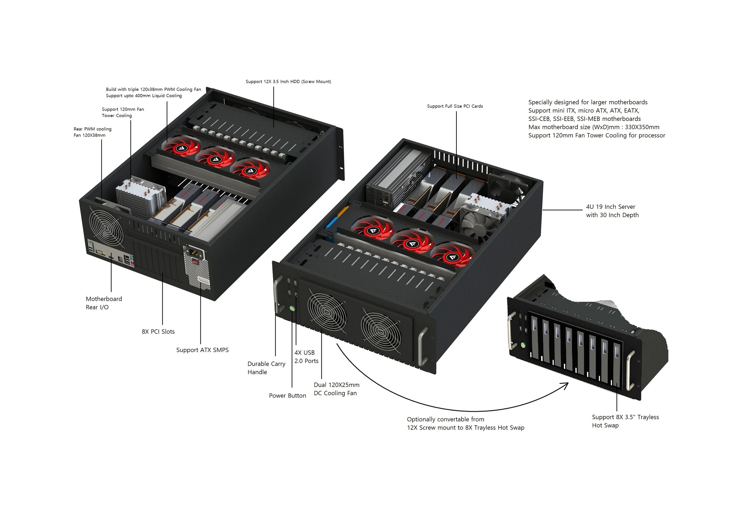 This 4U Rackmount Server case is designed to support multiple drives and multiple larger GPU. This server case support Mini ITX / MicroATX / ATX / EATX / SSI EEB / SSI CEB / SSI MEB motherboard, This case support 1 ATX SMPS. Built with 2 Nos of 120mm cooling fans and 4 Nos USB 2.0 at the front. At the back side one 120mm fan PWM installed for air intake This fully industrial case also compatible with liquid cooling build with 3 Nos 120mm fans.