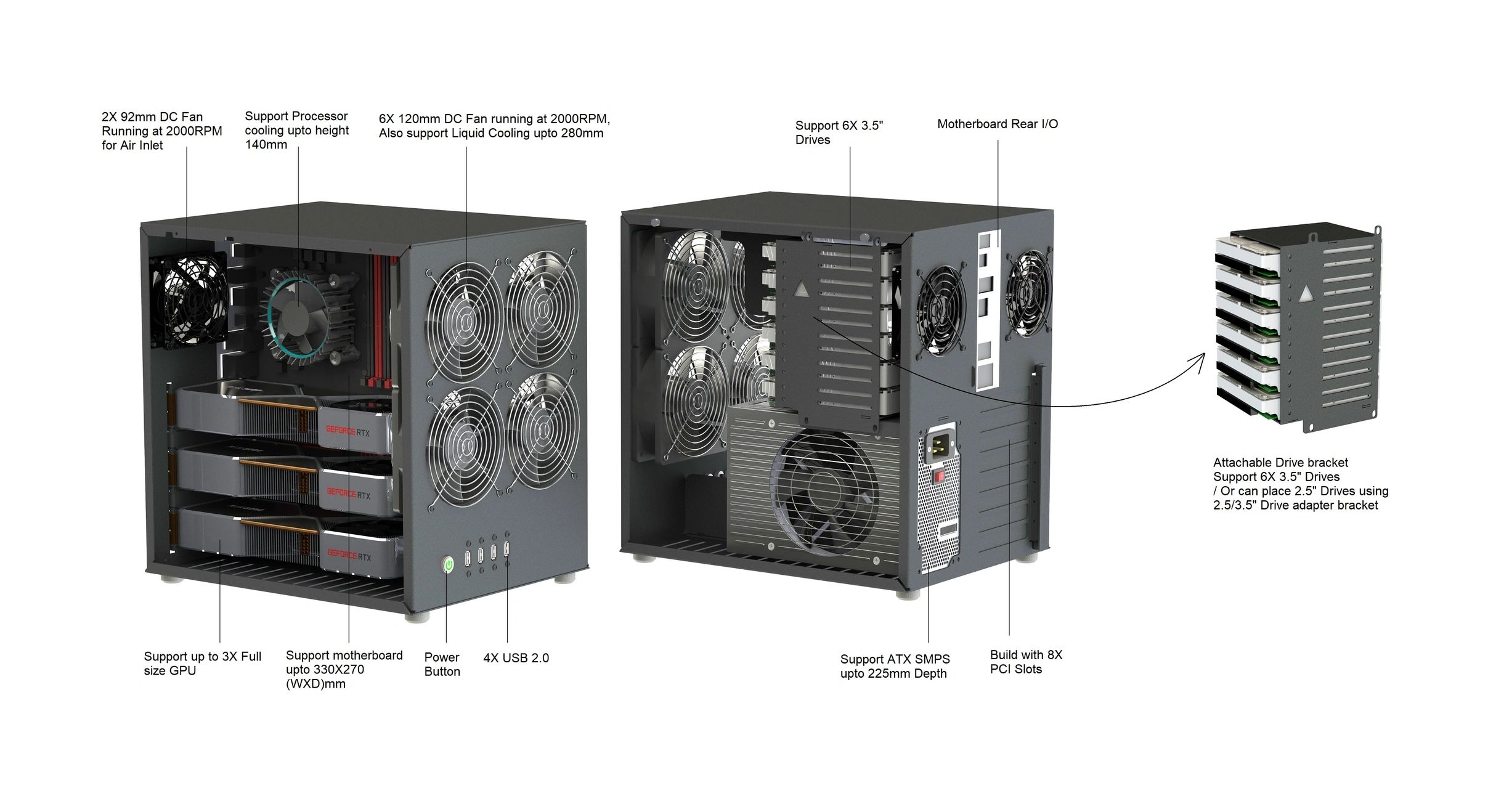 The EM5 Industrial PC case is the upgraded version of EM2 designed for gamers with supporting multiple drives and multiple GPU. This small PC case support upto 6 Nos 3.5" Drives so that it can also be used as a small desktop NAS, This case support 1 ATX SMPS. Built with 4 Nos of 120mm cooling fans and 4 Nos USB 2.0 at the front. At the back side two 92mm fan installed for air intake. This fully industrial case also compatible with 270mm dual fan liquid cooling.