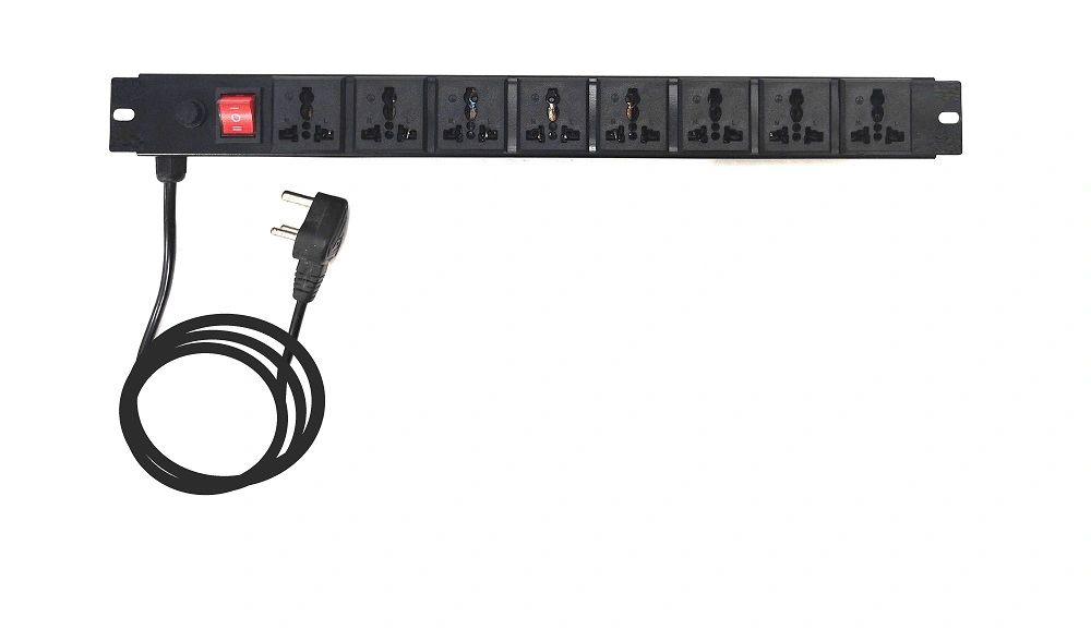 19 Inch U Rack mount PDU manufactured in metal, Build with 8 high quality sockets and power switch which are replaceable, Glow type power button indicate AC mains and it is protected through a 10A fuse. Cable length 1.5 meter with 3Pin indian Plug.